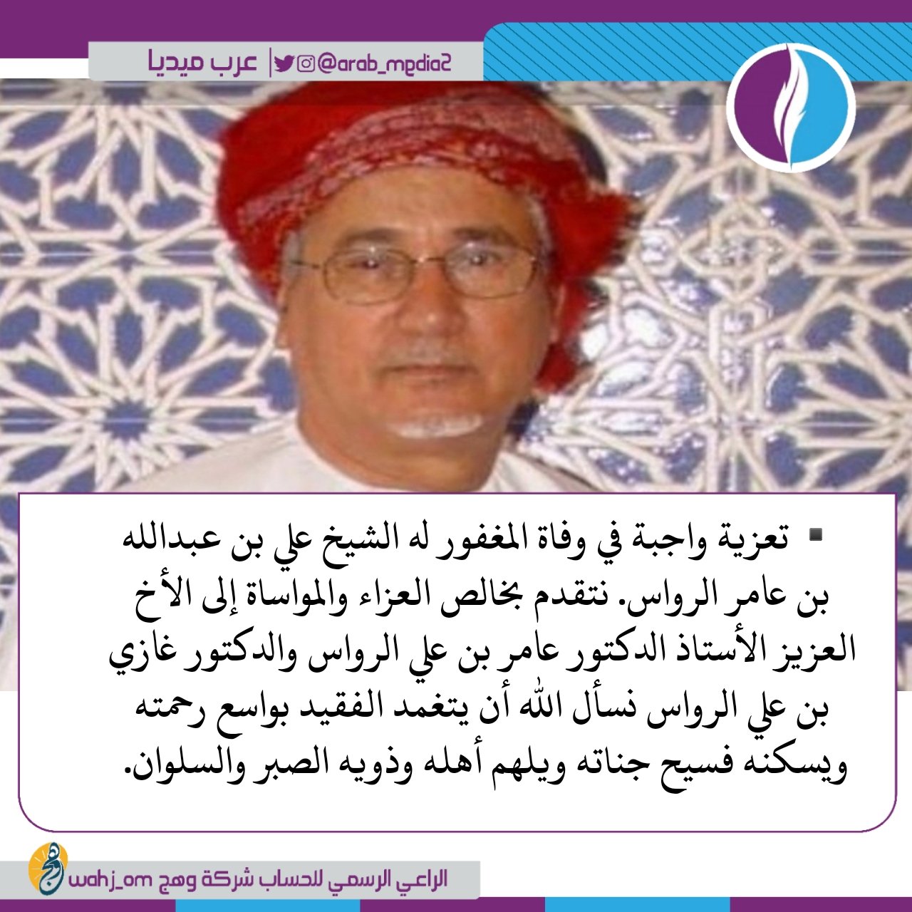 عرب ميديا On Twitter تعزية واجبة في وفاة المغفور له الشيخ علي بن عبدالله بن عامر الرواس نتقدم بخالص العزاء والمواساة إلى الأخ العزيز الأستاذ الدكتور عامر بن علي الرواس والدكتور غازي