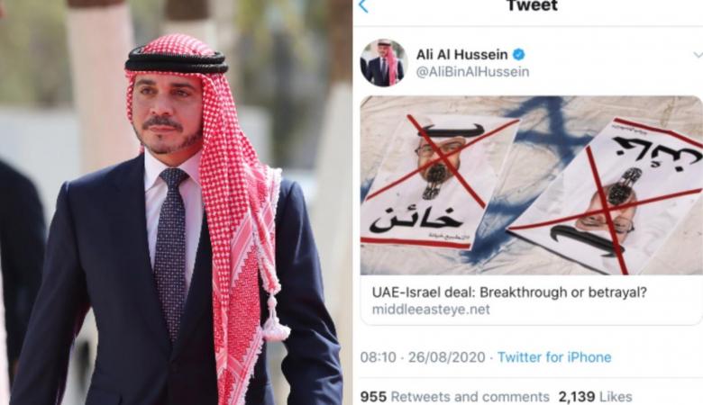 أثارت تغريدة للأمير الأردني علي بن الحسين على حسابه الموثق في موقع تويتر والتي شارك فيها مقالا يهاجم التطبيع الإماراتي مع سلطات الاحتلال زوبعة وخلفت عاصفة بعد اختفائها.