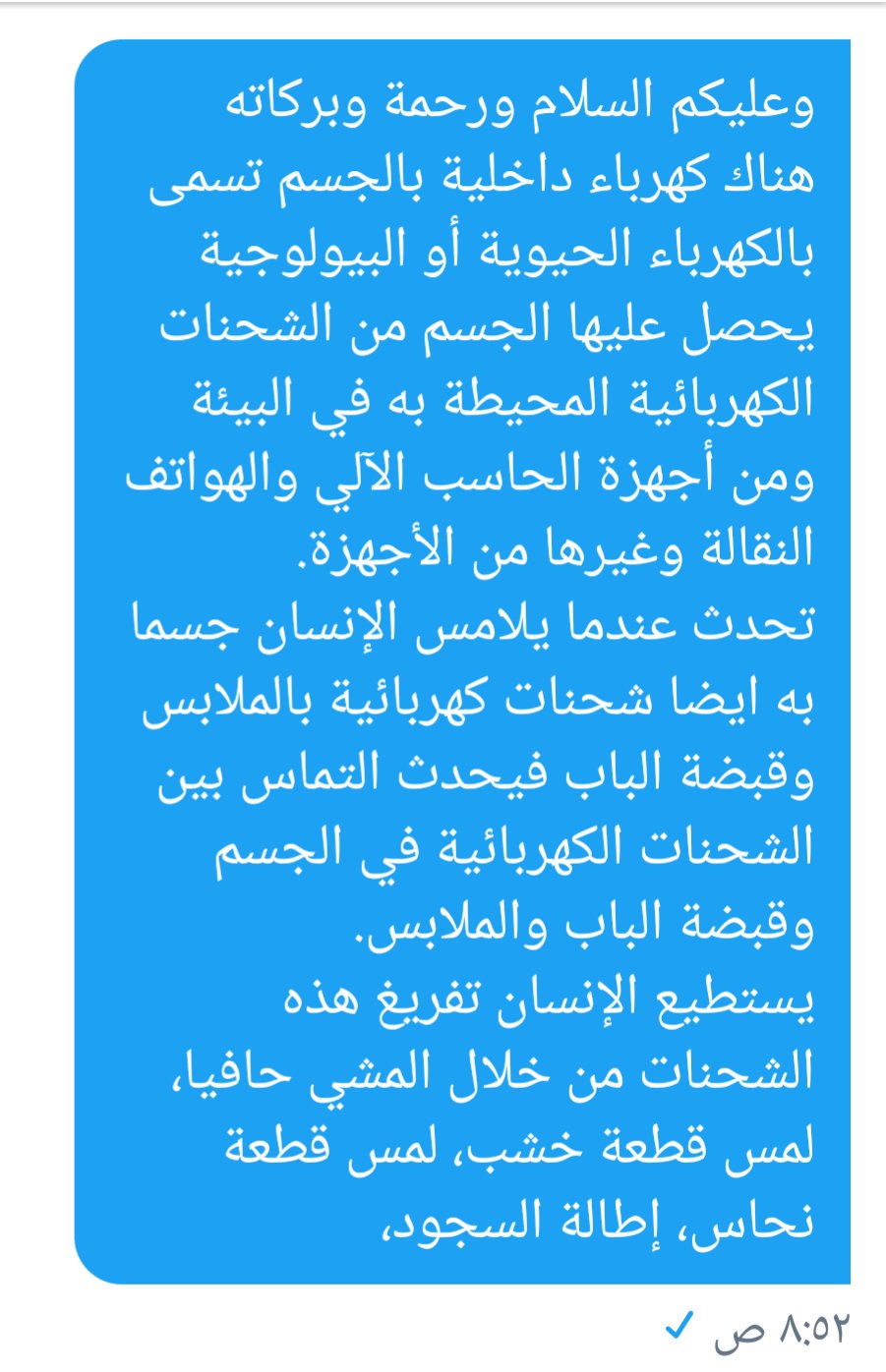 تفريغ الشحنات الكهربائيه من الجسم. لبس الحلى الفضية الطريقة الثانية. يشعر الكثير من الناس في بعض الأحيان بوخز مؤلم عند ملامسة المواد الجلدي ة والشعر والأدوات الكهربائية والمعادن والملابس التي يدخل الصوف والنايلون في تركيبها أو عند مصافحة. هناك أسباب تساعد على تخزين الشحنات الكهربائية في الجسم وهي ما تظهر في صورة لسعة الكهرباء من آن لآخر وهذه الظاهرة قد تحدث في حالة لبس ملابس مصنوعة من ألياف صناعية أو الأصواف. إن تعبير الشحنات الكهربائية الزائدة في الجسم هو تعبير ي ستعمل لوصف حالتين مختلفتين يجب التمييز بينهما حيث إن الحالة الأولى ت مث ل اختلالا في انتظام الدورة الكهربائية المتعلقة بالمخ حيث إن.